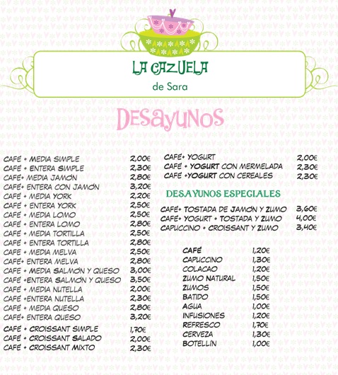 En este apartado te presentamos nuestra carta de desayunos. ¡Vamos! el desayuno es la comida más importante del día, y nosotros prometemos que aquí, en LA CAZUELA de Sara...¡ La disfrutarás!